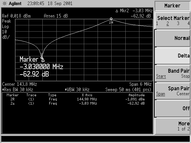 This is the opposite of the band pass response and the coaxial resonator is placed in the feed line as is shown. At the frequency of resonance the tuned circuit begins to accept energy from the coax feed reducing the amount of power reaching the spectrum analyzer, hence the dip in the swept response. However, as you can see, the overall depth of the notch is only 18 dB. This depth is governed by the amount of coupling; the greater the coupling the deeper and broader the notch becomes, the less the coupling the shallower and the narrower it becomes